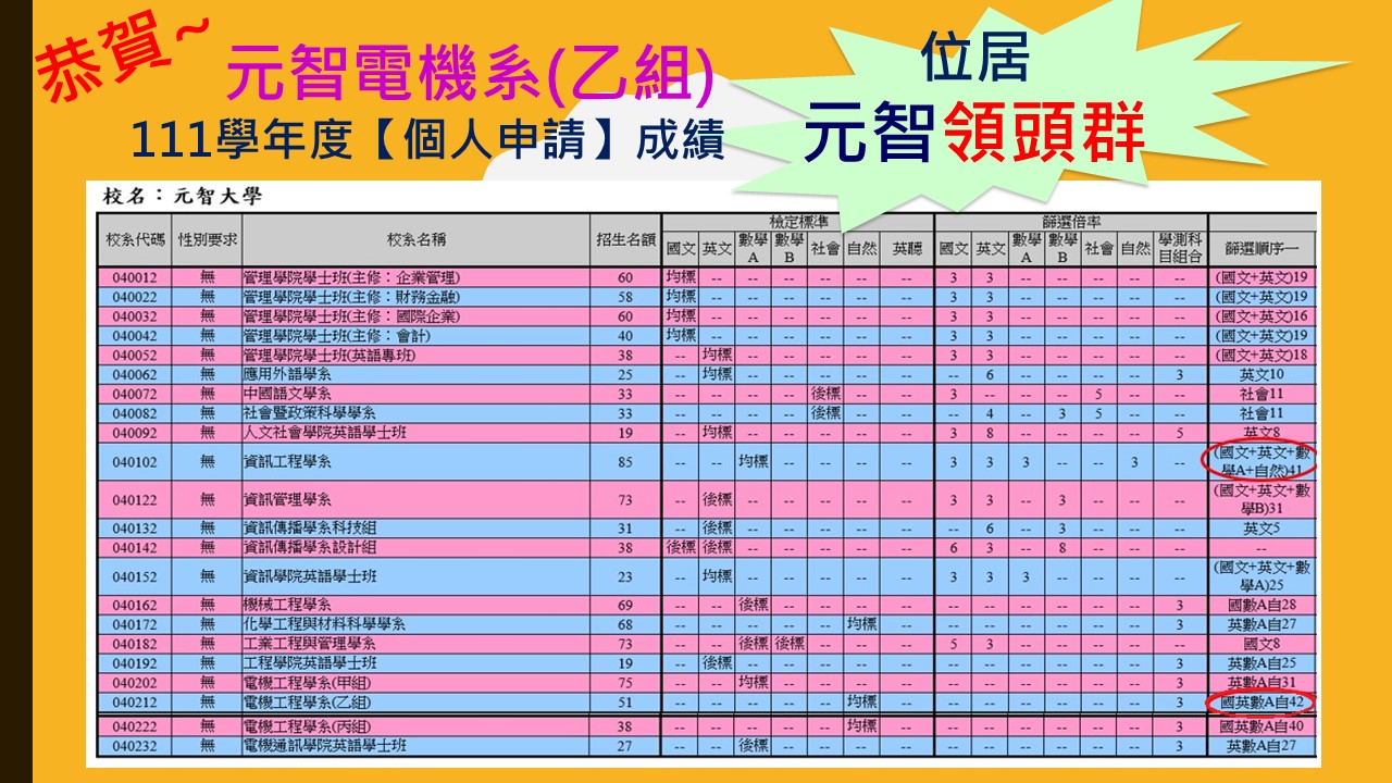 恭賀~元智電機系(乙組) 111學年度【個人申請】成績,位居元智領先群
