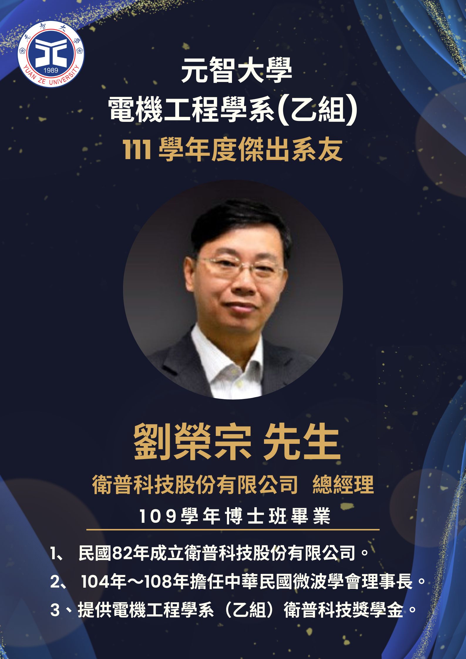 賀!衛普科技劉榮宗總經理獲111學年傑出系友