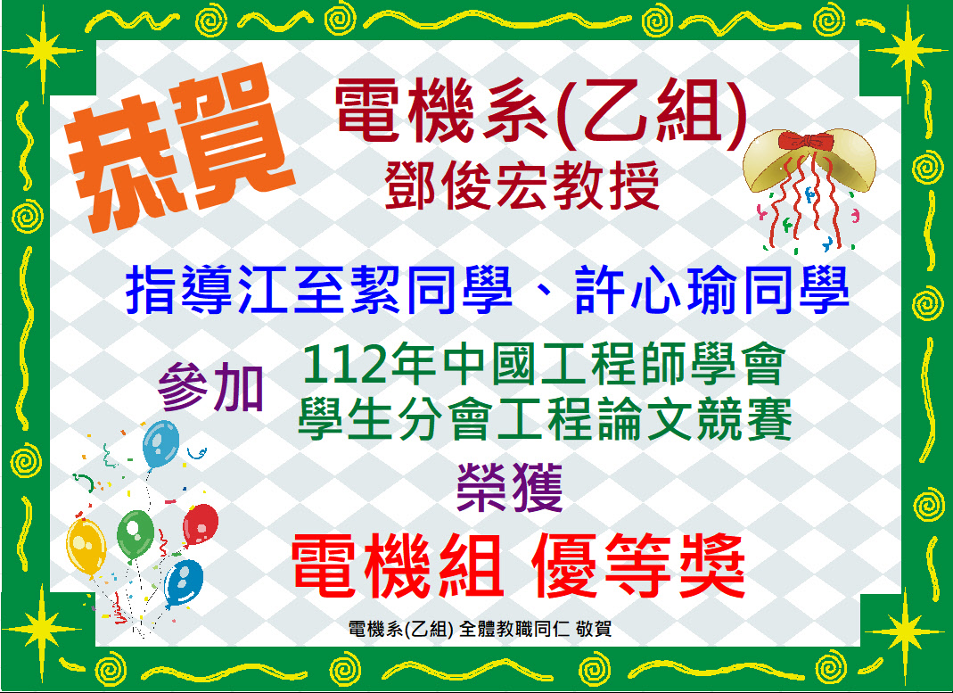 恭賀~鄧俊宏教授指導學生參加112年中國工程師學會學生分會工程論文競賽 榮獲 優等獎