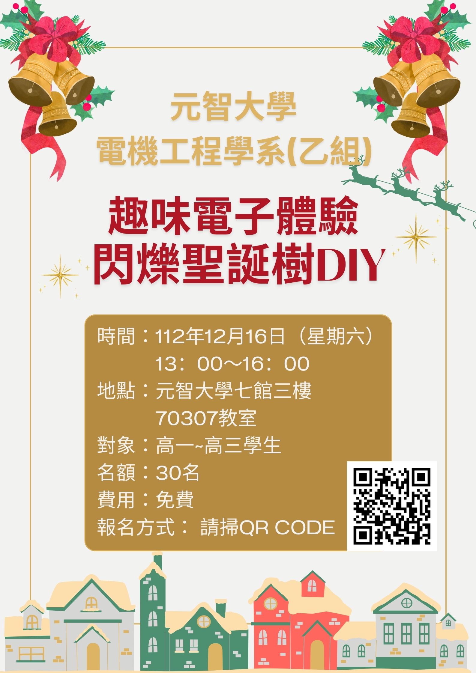 聖誕節前夕,配合本校12/15-16【花Young元智】Open Day – 元智嘉年華活動,特別安排一場趣味電子體驗,讓同學們親手製作一棵屬於自己的聖誕樹,感受濃濃的聖誕氣氛,歡迎高中生踴躍報名參加,只有30個名額,快來報名喔!