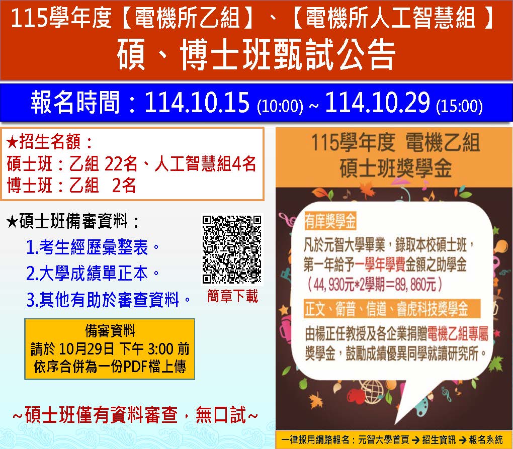 115學年度【電機所乙組】、【電機所人工智慧組 】碩、博士班甄試公告