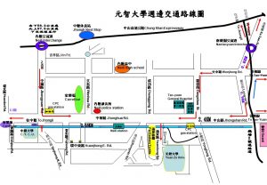 往北(右)步行約五分鐘,則可看見中華路與遠東路口有元智大學指示牌,右轉過平交道,再沿右邊步行約十分鐘即可抵達。