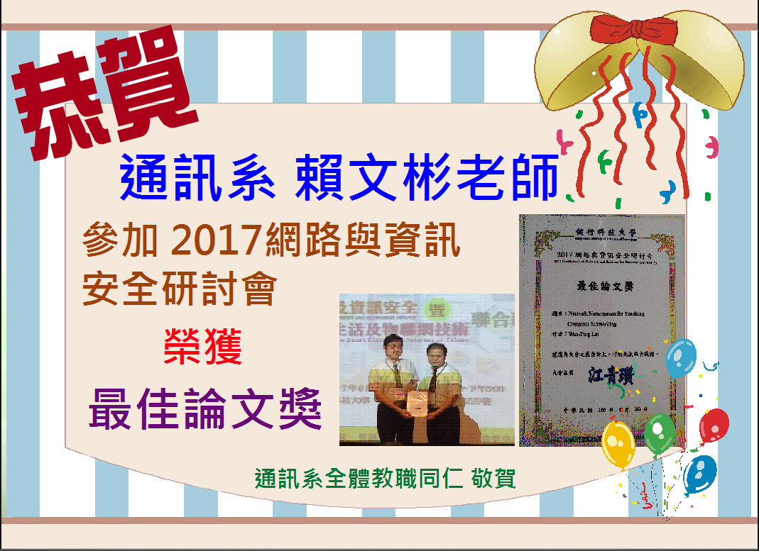2017-06-22 恭賀 賴文彬老師 參加 2017網路與資訊安全研討會,榮獲最佳論文獎!