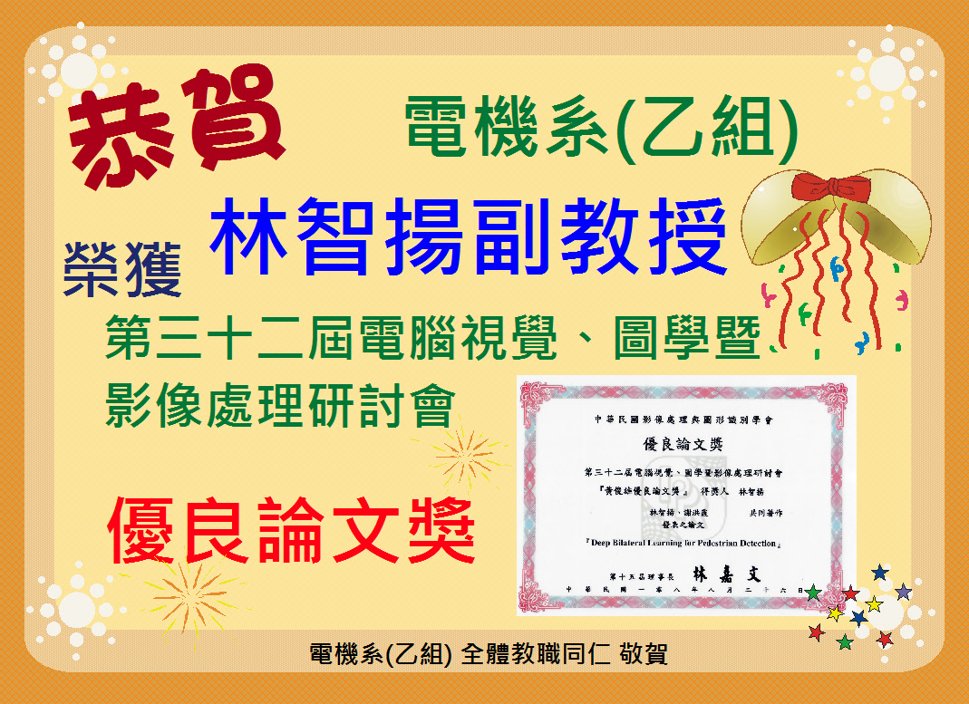 2019-08-29 恭賀~林智揚副教授榮獲第三十二屆電腦視覺、圖學暨影像處理研討會 優良論文獎