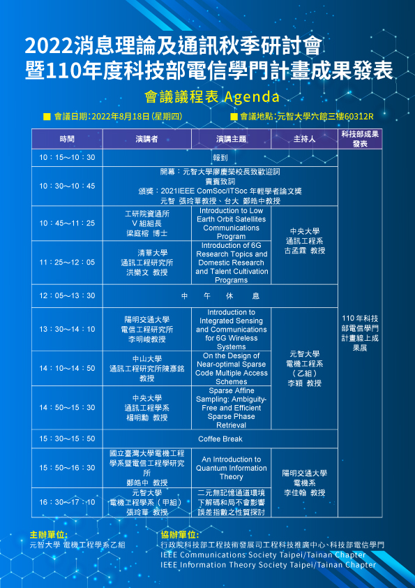 2022消息理論及通訊秋季研討會暨110年度科技部電信學門計畫成果發表會