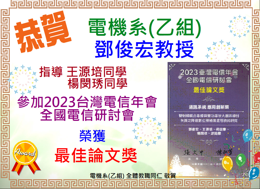 恭賀~鄧俊宏教授 指導學生參加「2023台灣電信年會 全國電信研討會」榮獲最佳論文獎