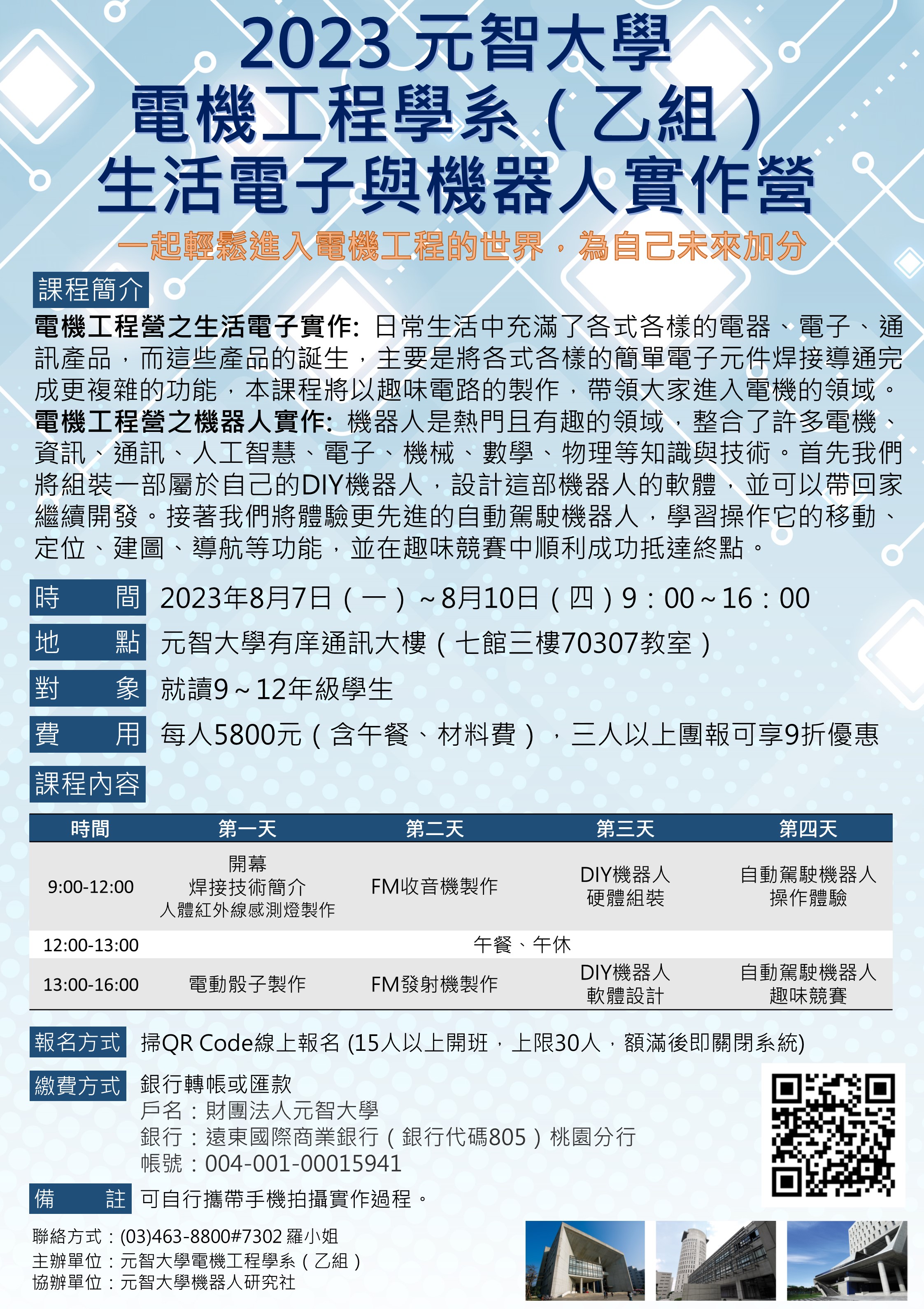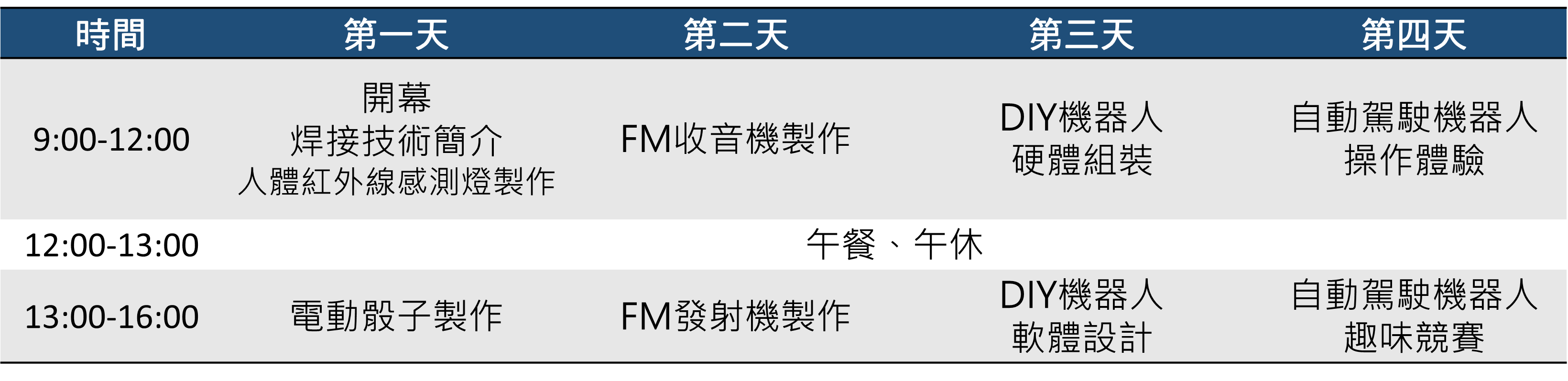 電機工程營之機器人實作: 機器人是熱門且有趣的領域,整合了許多電機、資訊、通訊、人工智慧、電子、機械、數學、物理等知識與技術。首先我們將組裝一部屬於自己的DIY機器人,設計這部機器人的軟體,並可以帶回家繼續開發。接著我們將體驗更先進的自動駕駛機器人,學習操作它的移動、定位、建圖、導航等功能,並在趣味競賽中順利成功抵達終點。