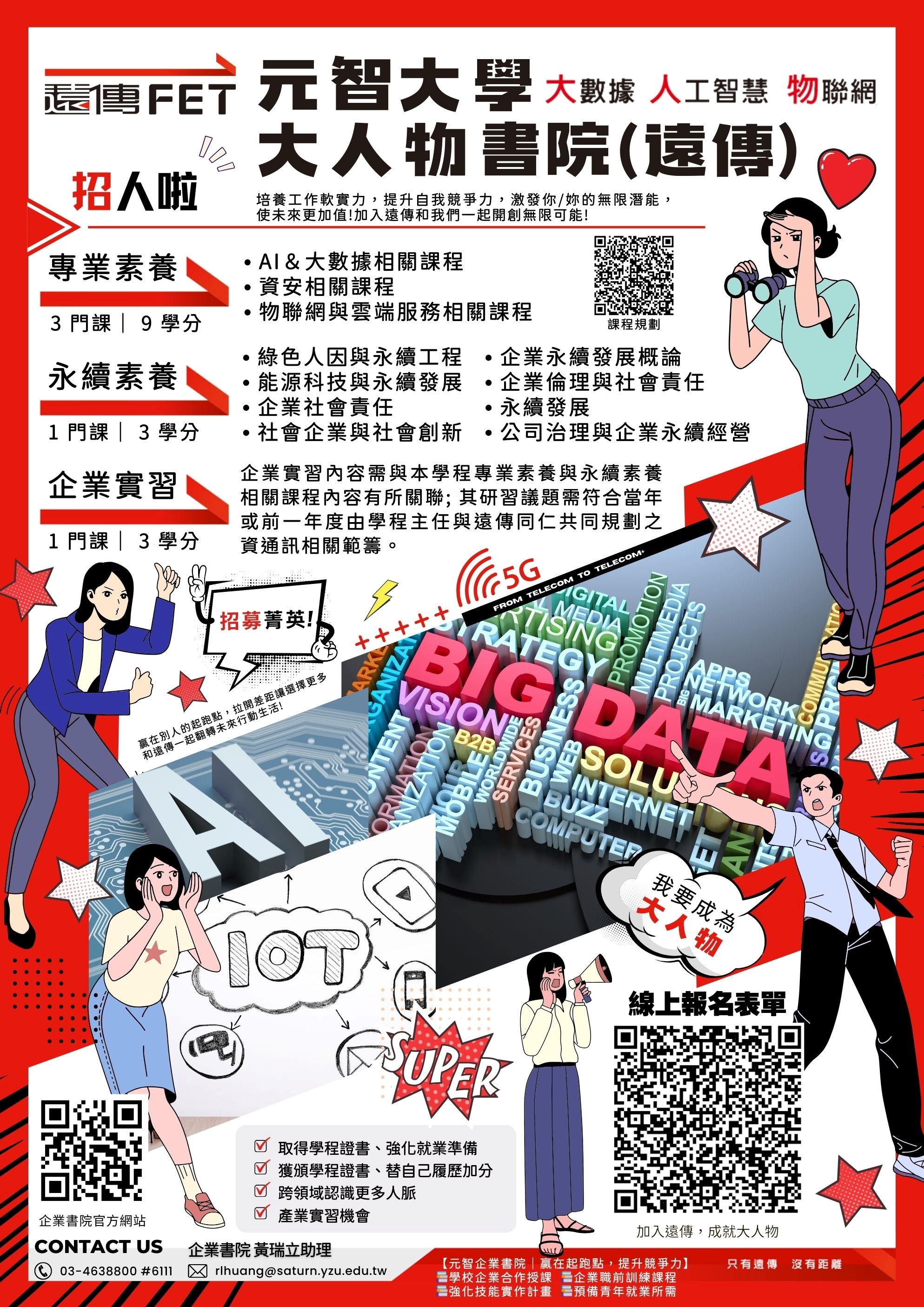【大人物書院聯絡資訊】 【聯絡窗口】企業書院|黃瑞立先生 【聯絡電話】(03)463-8800分機6111 【電子郵件】rlhuang@saturn.yzu.edu.tw 【時 間】週一至週五 08:30-16:30 【地 點】元智大學企業書院(七館10樓,R71008B室) |