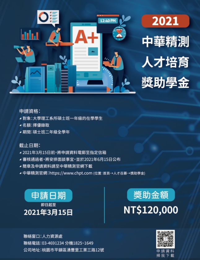 精測人才培育不落人後,歡迎各大院校同學申請 ◆對象:大學理工系所碩士班一年級的在學學生 ◆名額:擇優錄取 ◆期間:碩士班二年級全學年 ◆截止日期:2021/3/15前 將申請資料寄至指定email