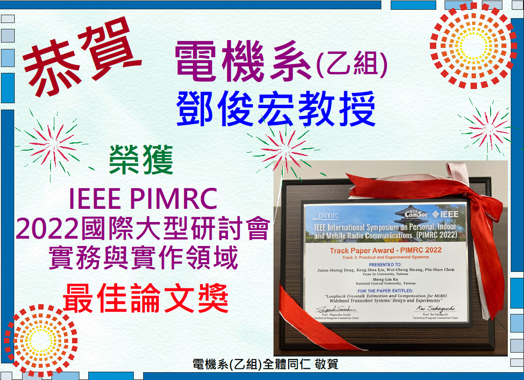 恭賀~鄧俊宏教授榮獲IEEE PIMRC 2022國際大型研討會 實務與實作領域 最佳論文獎