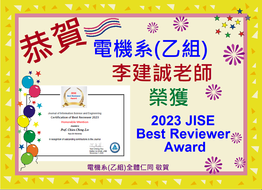恭賀~李建誠老師榮獲「2023 JISE Best Reviewer Award」