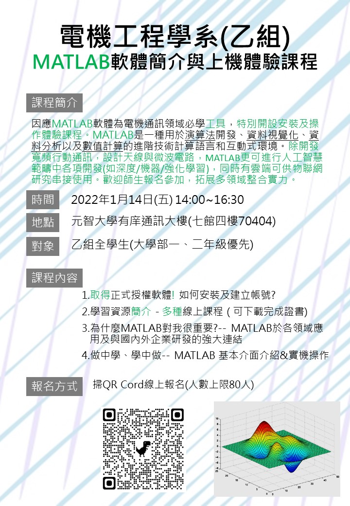 MATLAB軟體簡介與上機體驗課程-2022年1月14日(五) 14:00~16:30