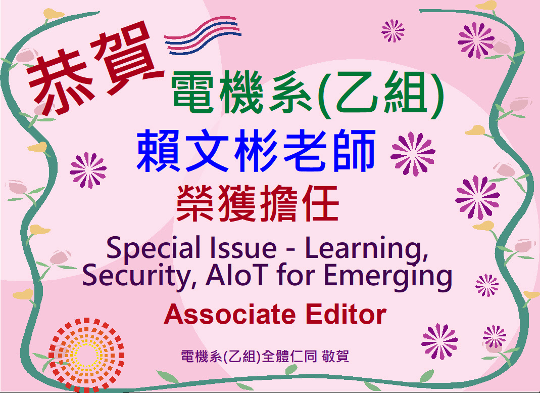 恭賀~賴文彬老師榮獲擔任 Special Issue - Learning, Security, AIoT for Emerging CommunicationNetworking Systems 之